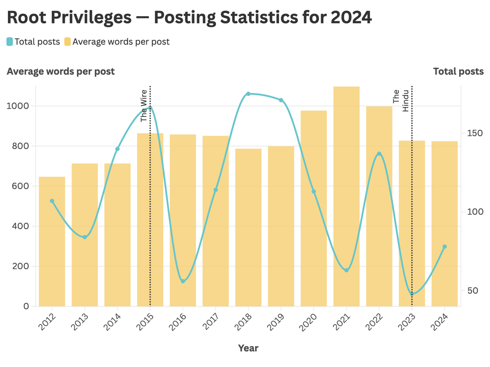 When I joined The Wire in 2015, the average length of my blog posts increased from around 700 words to around 850 words, and over time to 1,000 words. This wasn't forced so much as a natural reflection of the average length of pieces that worked on The Wire, also around 1,000 words. The trend held through 2018 and 2019 as well: the average post length dipped in these years because I published a very large number of posts and many of them were short, vignette-like. The same 'natural forcing' happened when I joined The Hindu in January 2023, with the average blog post length matching what worked at my workplace. I don't understand exactly how this happens but I'm glad that it does.