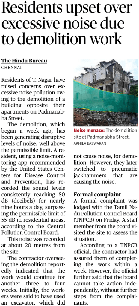 The situation continued into Tuesday. At this point we began to wonder if the article in The Hindu might have had anything to do with it. Late last week, after we'd lodged out complaint with the Tamil Nadu Pollution Control Board (TNPCB), I reached out to one of my colleagues at The Hindu asking if they could help expedite the board's response. Apparently they did, and they also arranged for the noise complaints to be covered as a small item in the paper the next day (November 16).