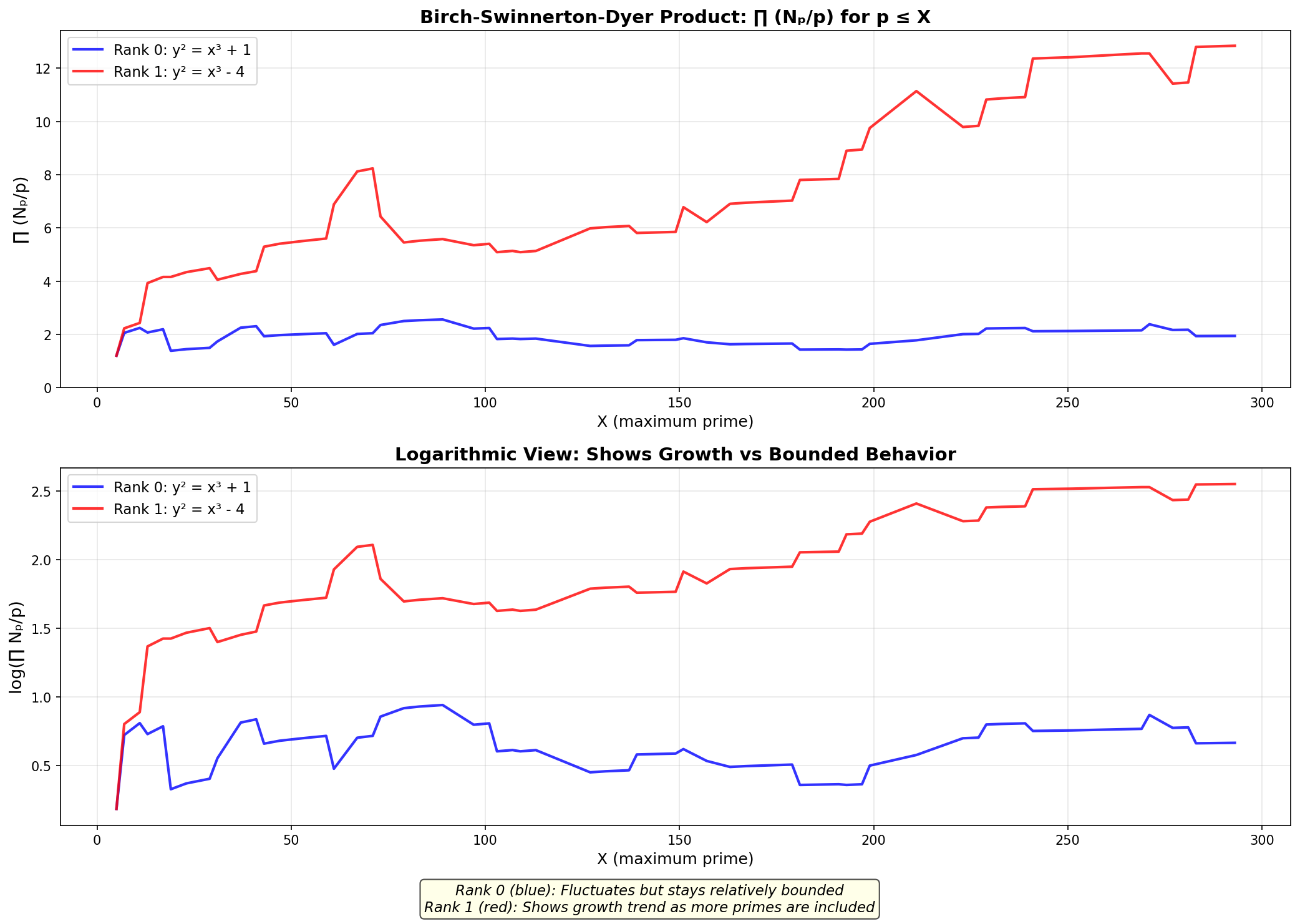Overall, Birch and Swinnerton-Dyer noticed that curves with finite rational points, i.e. rank 0, had a relatively bounded product. And curves with infinite rational points, i.e. rank ≥ 1, had a boundless product.