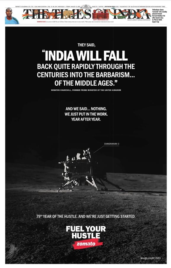 India may appear today to have progressed well past Winston Churchill's belief, expressed in the early 1930s, but to advertise as Zomato has is to imply that it remains on our minds and animates the purpose of what we're trying to do. It is a juvenile and frankly resentful attitude that also hints at a more deep-seated lack of contentment. The advertisement's achievement of choice is the Chandrayaan 3 mission, its Vikram lander lit dramatically by sunlight and earthlight and photographed by the Pragyan rover. The landing was a significant achievement, but to claim that that above all else describes contemporary India is also to dismiss the evident truth that a functional space organisation and a democracy in distress can coexist within the same borders. One neither carries nor excuses the other.